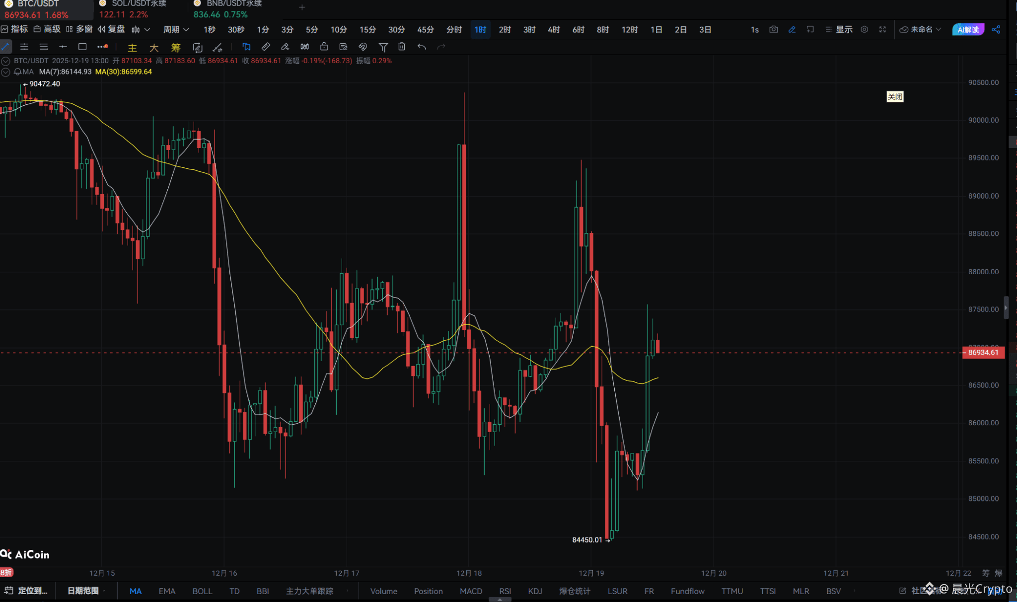 从1 小时级别的走势来看,比特币在早间冲高回落之后,并没有出现持续性下跌,而是回到了 8.6 万—8.7 万这一带进行整理。