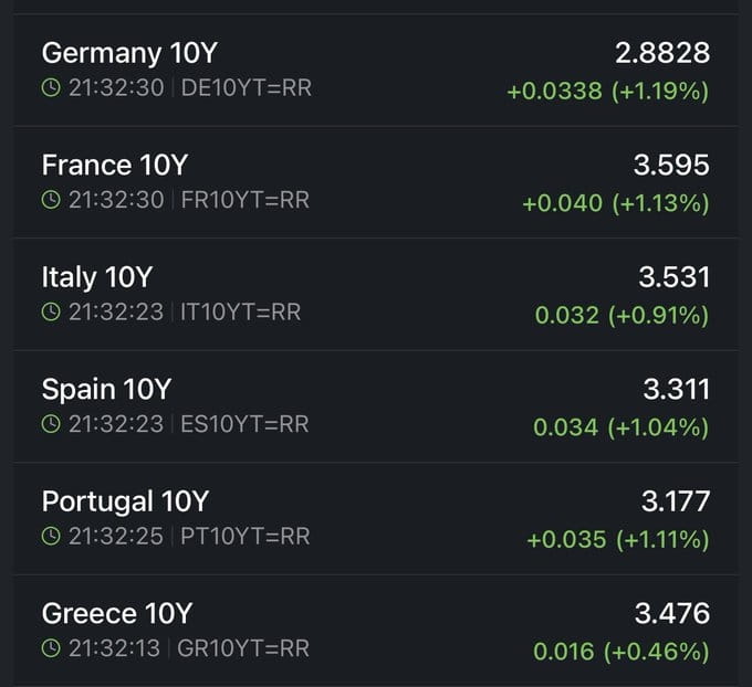 Se controlli i numeri dei titoli di stato europei di oggi, noterai un chiaro schema emergere. I rendimenti tedeschi a 10 anni sono saliti al 2,88%, in aumento di oltre l'1%. I titoli francesi sono al 3,59%, anch'essi in aumento di più dell'1%. L'Italia è al 3,53%, la Spagna al 3,31%, il Portogallo al 3,17%, e anche la Grecia mostra movimento al 3,47%.