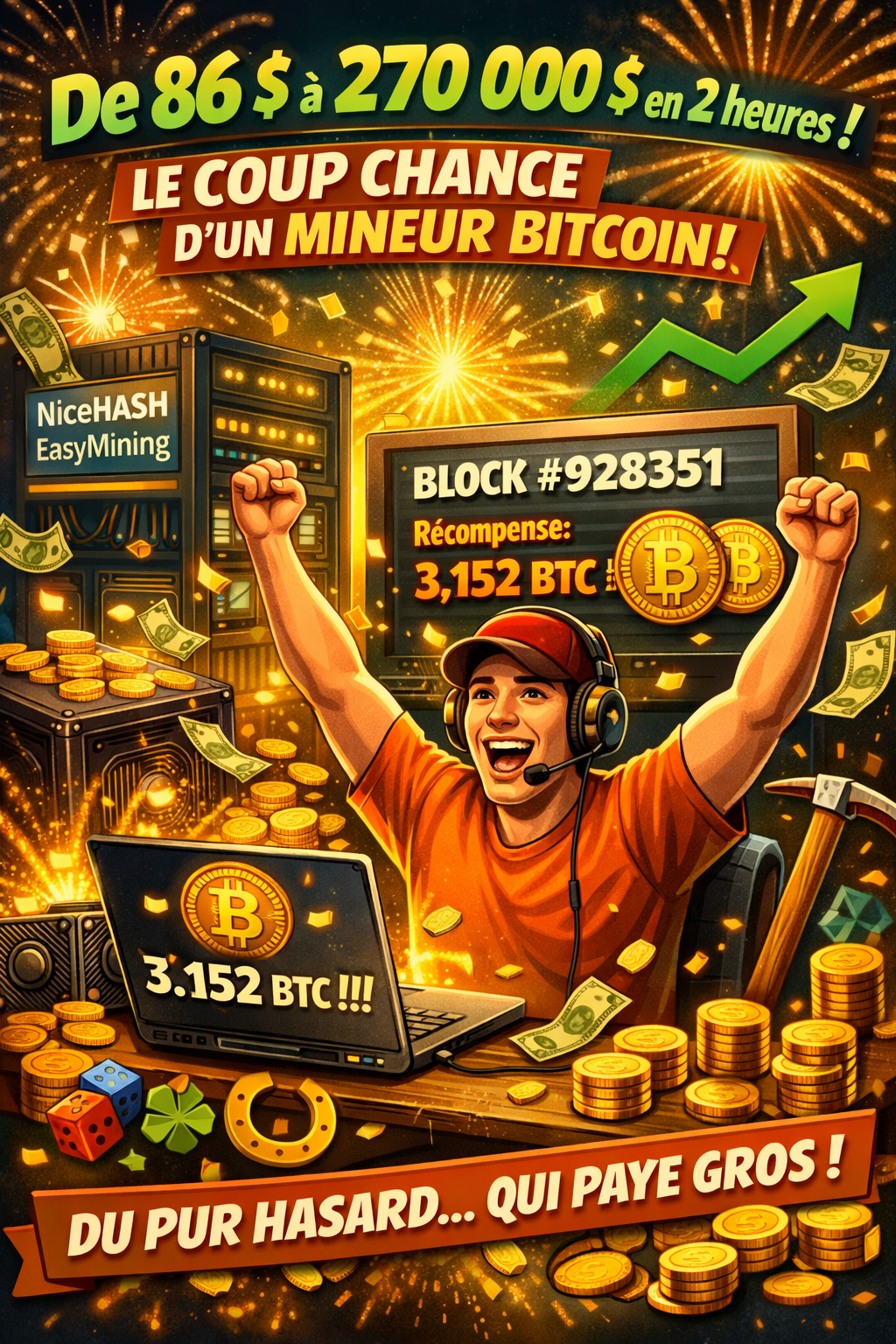 E lì, il colpo di fortuna: ha trovato il blocco numero 928 351 sulla blockchain Bitcoin. In premio, ha ricevuto 3,152 BTC, l'intero premio assegnato a chi convalida un blocco. Un raro successo nell'universo del minaggio. �