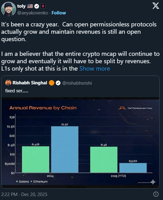 Il fondatore di Solana, Anatoly Yakovenko, ha condiviso nuovi dati che mostrano come Solana abbia superato Ethereum nelle entrate annuali, evidenziando ciò che vede come un cambiamento cruciale nel modo in cui il valore potrebbe essere distribuito nel mercato delle criptovalute.