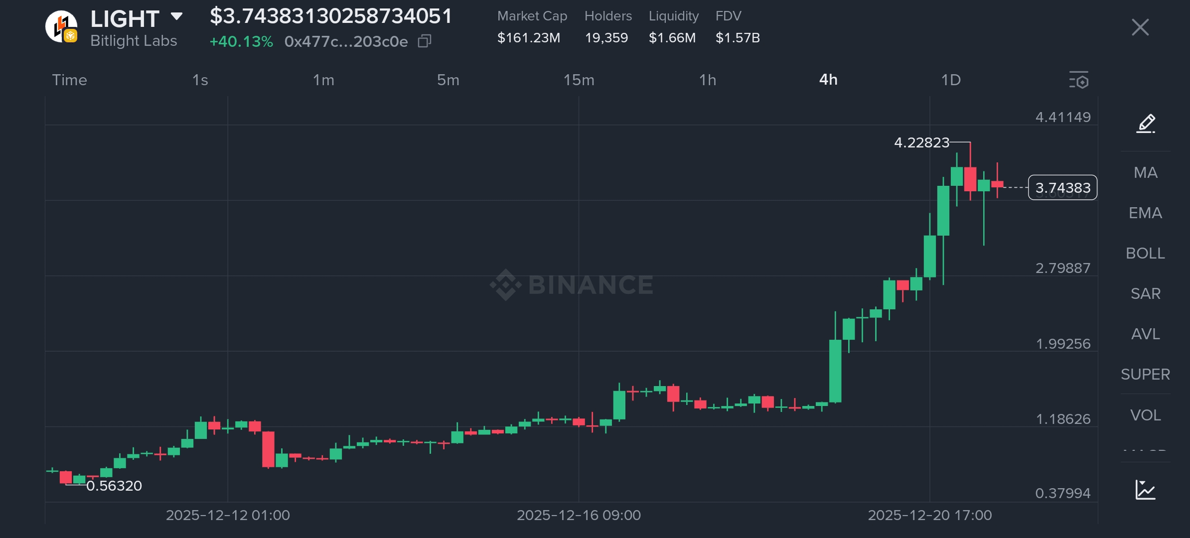 Il prezzo attuale del token alpha $LIGHT è di $3.81. Solo tre ore fa, veniva scambiato a $4.22, mentre due giorni fa il prezzo era solo di $1.38. Questo indica che il token è aumentato di quasi 4 volte in soli due giorni.