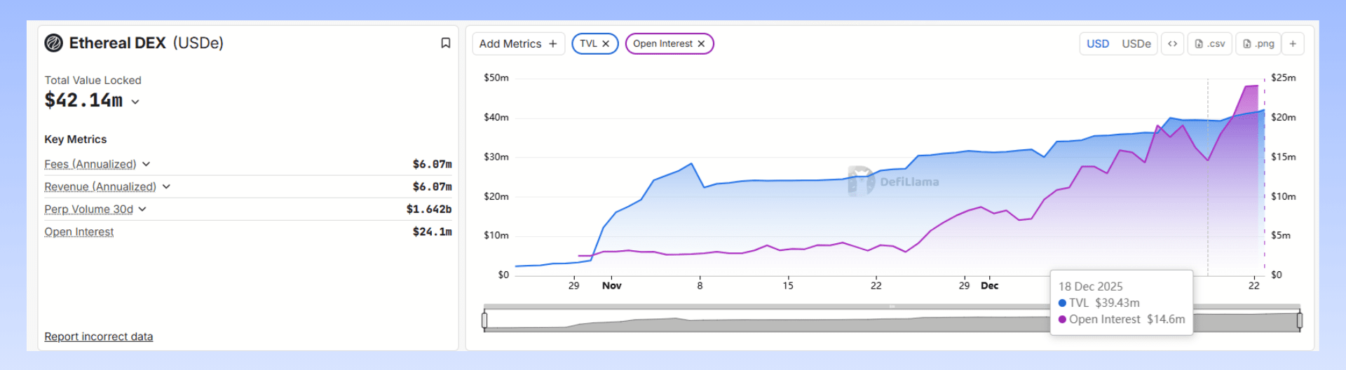 Ethereal spera di utilizzare meccanismi di incentivazione per incoraggiare i fondi a rimanere sulla piattaforma e garantire che vengano utilizzati per il trading. I dati mostrano che l'open interest di Ethereal è aumentato del 70% in soli quattro giorni (18-22 dicembre).