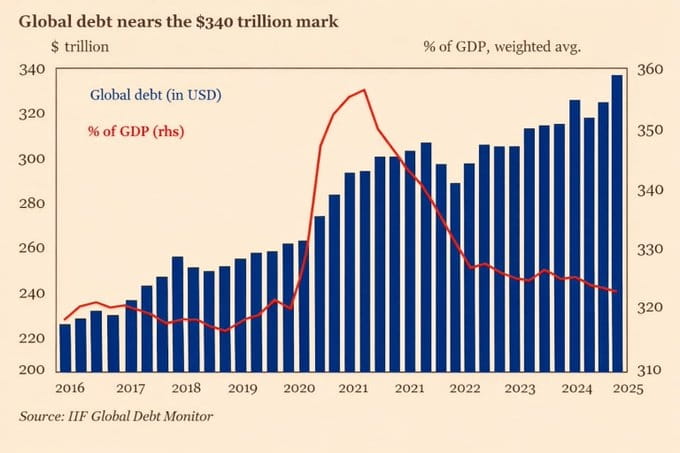 Il debito globale ha ufficialmente superato la soglia dei 340 trilioni di dollari. Sì, hai letto bene—trilione con una "T." Per mettere ciò in prospettiva, è più di tre volte l'intera produzione economica annuale del pianeta. Immagina di guadagnare 50.000 dollari all'anno ma di doverne 150.000—ora moltiplica questo per ogni paese, azienda e famiglia sulla Terra.