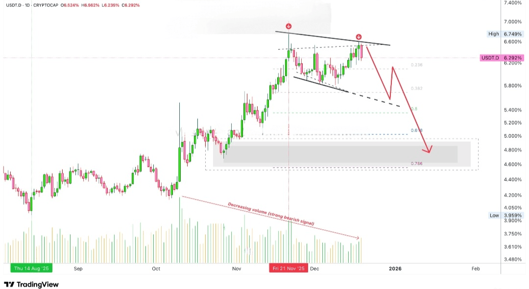 La Dominanza di Tether ha avuto un ultimo applauso ieri, comunque, un massimo inferiore. Oggi abbiamo una rottura di volume sul lato ribassista. Stiamo vedendo il volume più alto in un mese, dal 18-Novembre, insieme a una grande candela rossa. Questa grande candela rossa di oggi conferma il massimo inferiore di ieri. Questo indice sta scendendo, non si torna indietro.