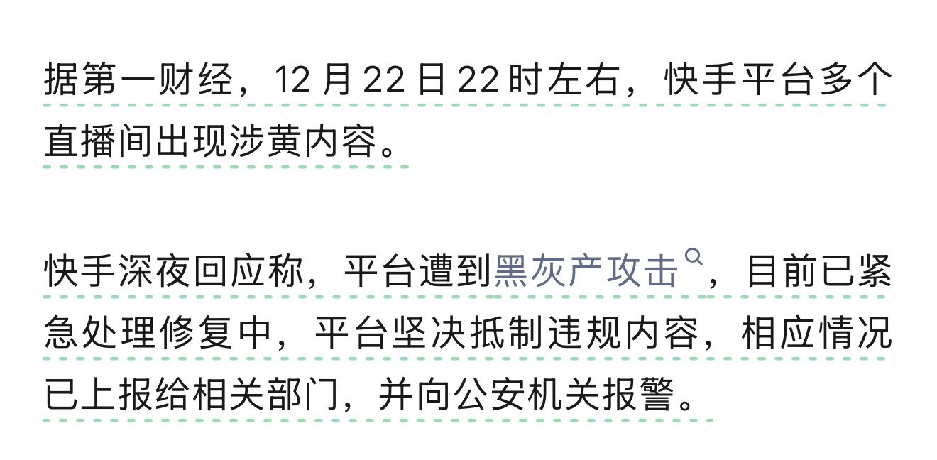 Secondo la conferma ufficiale di Kuaishou, intorno alle 22:00 del 22, la piattaforma ha subito un attacco da parte di attività illecite, causando la comparsa di contenuti non conformi in numerose stanze di livestreaming. Kuaishou ha risposto affermando di aver gestito urgentemente e riparato il problema, l'evento è stato segnalato alle autorità competenti e è stata presentata una denuncia alla polizia.