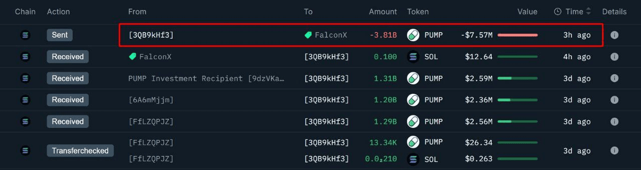 Una grande balena cripto ha appena trasferito 3.8B $PUMP , del valore di circa $7,57M, in FalconX, segnando la fine di un'attesa di 3 mesi.