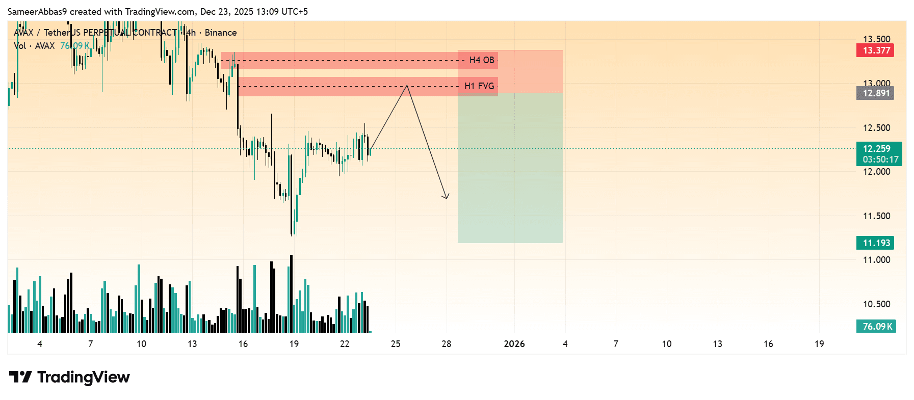 AVAX è attualmente leggermente bloccato in un range nei timeframe più piccoli, ma è ribassista nei timeframe più grandi come H1 e H4 e c'è un livello di liquidità a $12.649, quindi c'è la possibilità che salga per afferrare la liquidità e poi nella nostra zona di vendita e noi andremo short su AVAX dalla FVG+OB h1 e h4 nel trading futures.