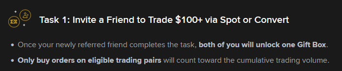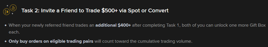 Un nuovo utente, per sbloccare i premi, deve generare il volume di trading richiesto sul proprio conto. È importante notare che contano solo gli ordini di acquisto (Buy Orders). Gli ordini di vendita di criptovalute non contano per il volume di trading richiesto per completare i compiti.