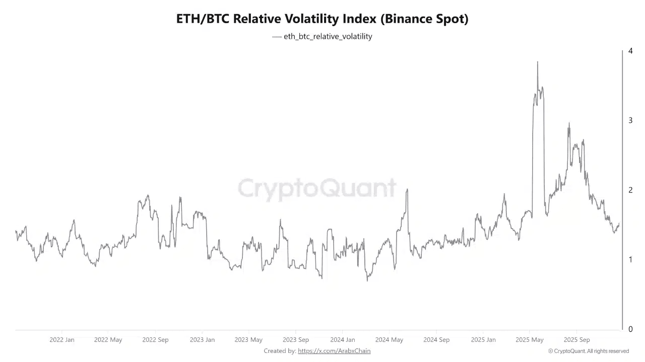 Sebbene ETH rimanga più volatile di BTC, la sua volatilità relativa è in calo. Gli investitori non sono ancora disposti ad assumere rischi maggiori.
