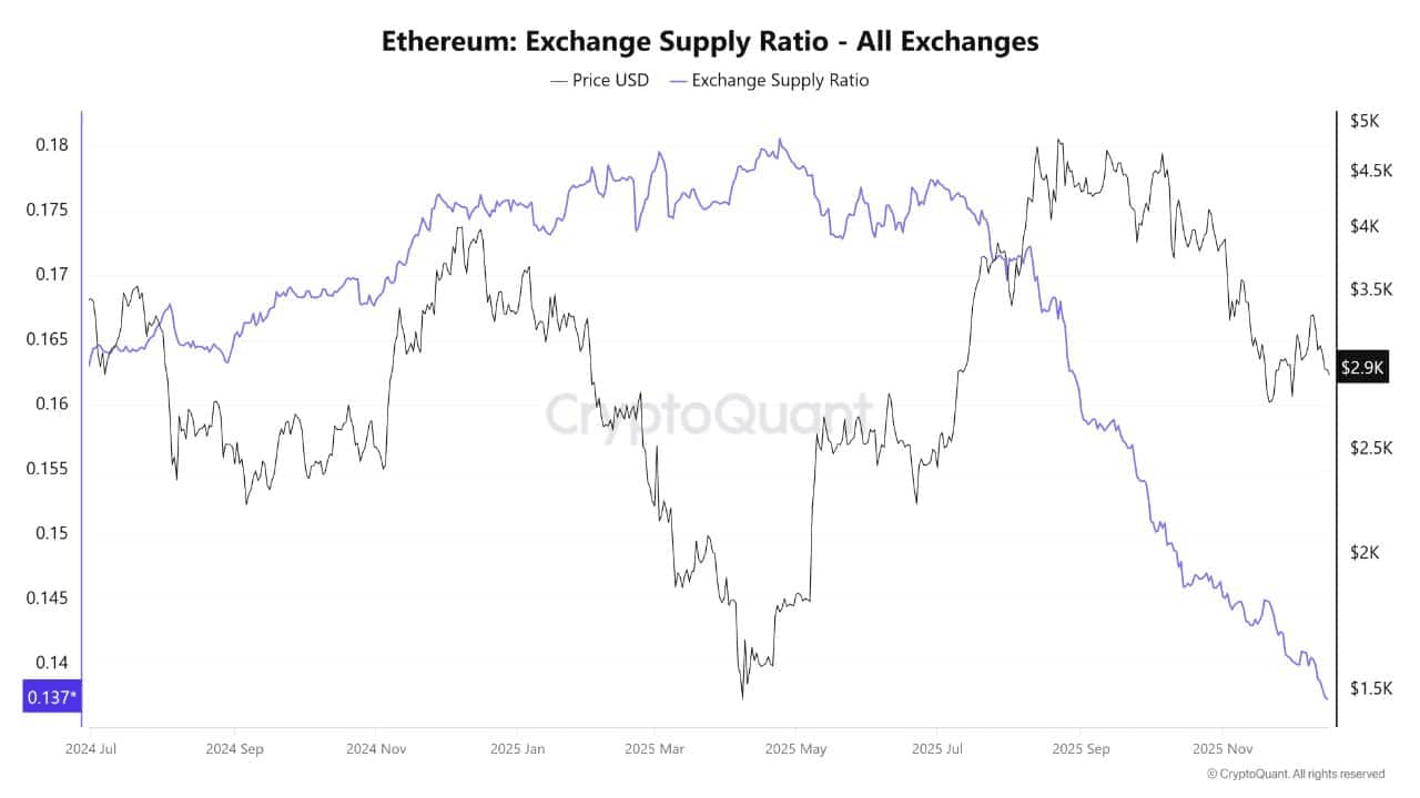 I saldi degli exchange hanno raggiunto un minimo di 7 anni, ma una debole propensione al rischio limita il potenziale a breve termine per ETH.