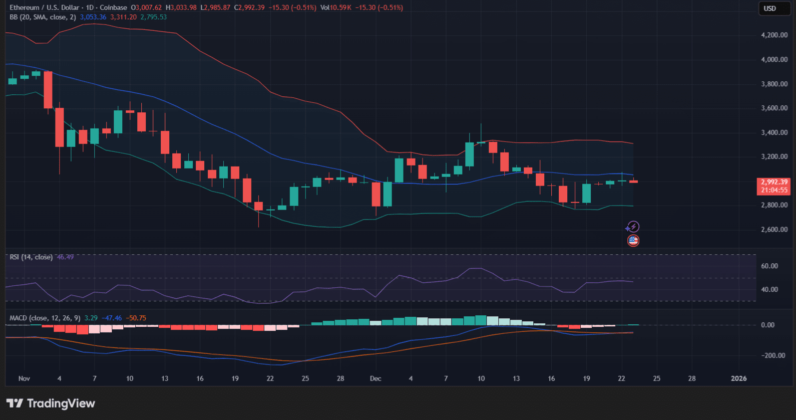 La mancanza di fiducia dei trader è evidente nei grafici. A breve termine, Ethereum rimane intrappolato in un intervallo ristretto, oscillando appena sotto il livello di $3.000 al momento della scrittura.