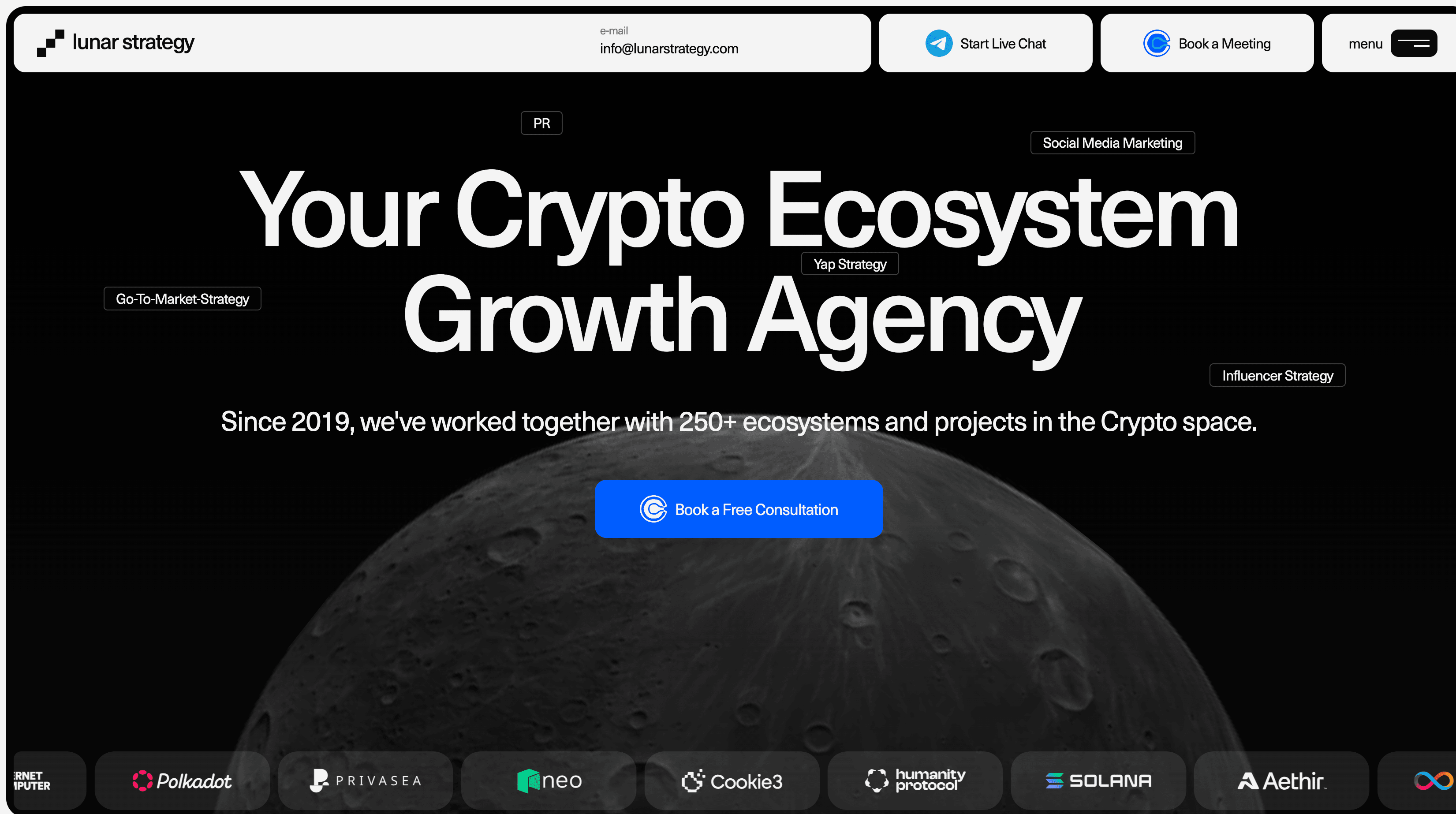 Lunar Strategy opera all'intersezione tra analisi e crescita Web3. Sottolineano funnel, metriche e marketing delle performance strutturato, rendendoli adatti per Web3 SaaS, piattaforme di analisi e prodotti ecosistemici a lungo termine.