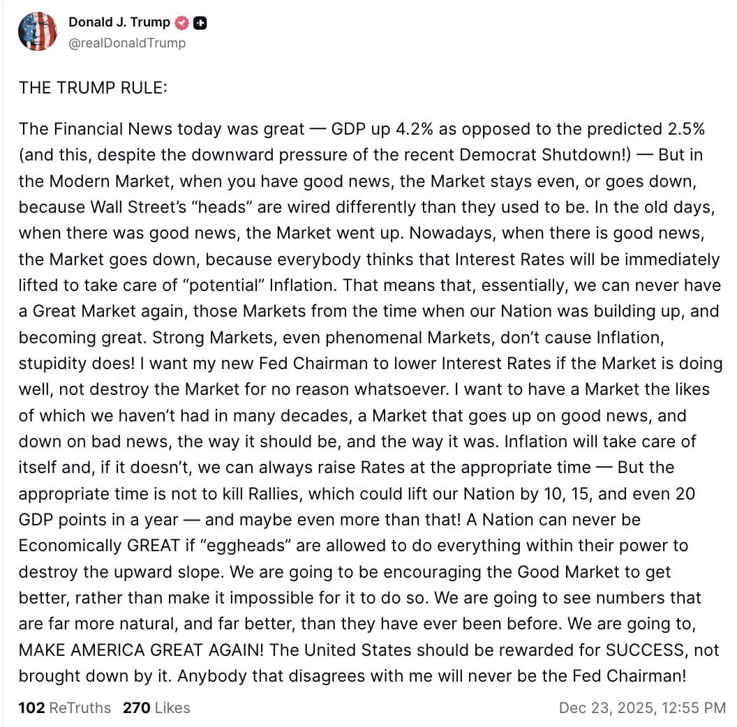 L'ex presidente degli Stati Uniti Donald Trump ha elogiato la crescita del PIL statunitense del 4,2%, superando le aspettative, ma ha avvertito che i mercati stanno declinando a causa di notizie economiche positive a causa della paura di aumenti dei tassi d'interesse. Ha accusato Wall Street e i funzionari della Federal Reserve di minare i rally di mercato e ha sostenuto che una forte crescita non guida l'inflazione. Trump ha dichiarato che la futura leadership della Fed dovrebbe abbassare i tassi durante i periodi di crescita e permettere ai mercati di salire su buoni dati economici.