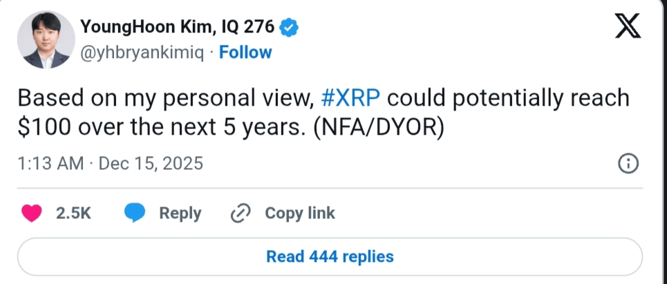 YoungHoon Kim, riconosciuto ufficialmente come il detentore di IQ più alto del mondo, ha previsto un obiettivo di prezzo di $100 per il token $XRP nei prossimi cinque anni. La comunità crypto è stata interessata a come sia arrivato a questa previsione.