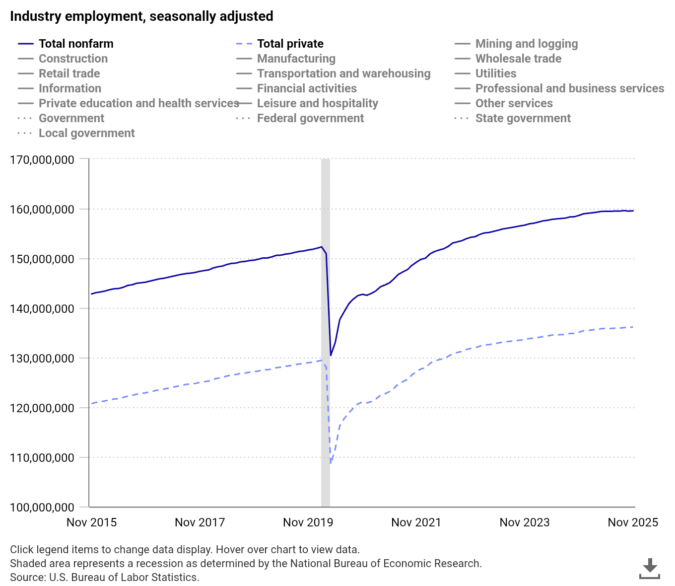 L'occupazione del governo federale ha continuato a diminuire a novembre (−6.000). Questo segue un forte calo di 162.000 a ottobre, poiché alcuni dipendenti federali che hanno accettato un'offerta di dimissioni differite sono stati rimossi dalle buste paga federali. L'occupazione del governo federale è scesa di 271.000 dal raggiungimento di un picco a gennaio. (I dipendenti federali in congedo durante la chiusura del governo sono stati conteggiati come occupati nell'indagine sull'occupazione perché hanno ricevuto lo stipendio, anche se più tardi del solito, per il periodo di pagamento che includeva il 12 del mese. I dipendenti in congedo retribuito o che ricevono un'indennità di licenziamento continuativa sono conteggiati come occupati nell'indagine sull'occupazione.)