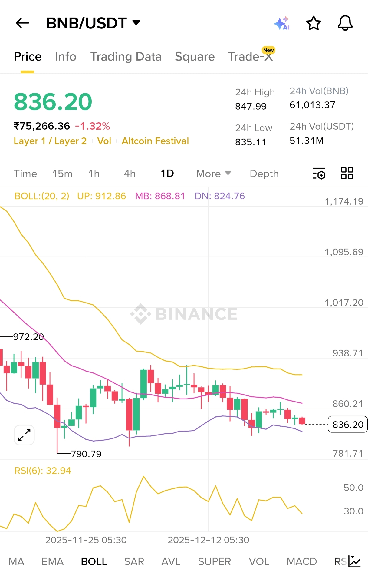 - BNB è intorno a 836–840 USDT, leggermente al di sotto delle recenti chiusure giornaliere e ben al di sotto del massimo di quest'anno vicino a 1,370 USDT, mostrando un notevole ritracciamento dal picco.