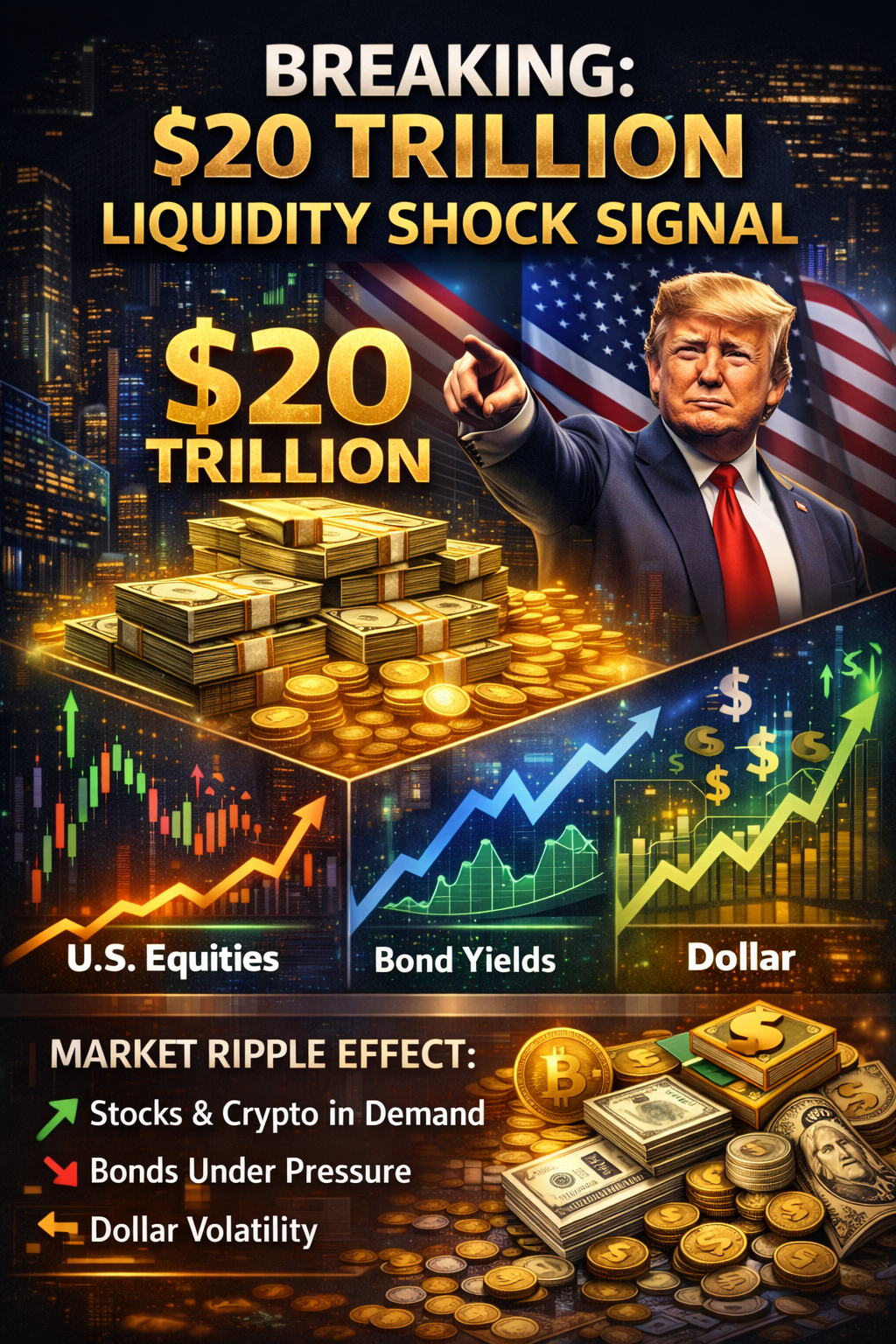 I mercati globali sono in allerta dopo che l'ex presidente degli Stati Uniti Donald Trump ha segnalato quello che potrebbe ammontare a un afflusso di capitale di 20 trilioni di dollari negli Stati Uniti, una scala di liquidità che—se anche solo parzialmente realizzata—potrebbe rimodellare la valutazione degli asset nei mercati.