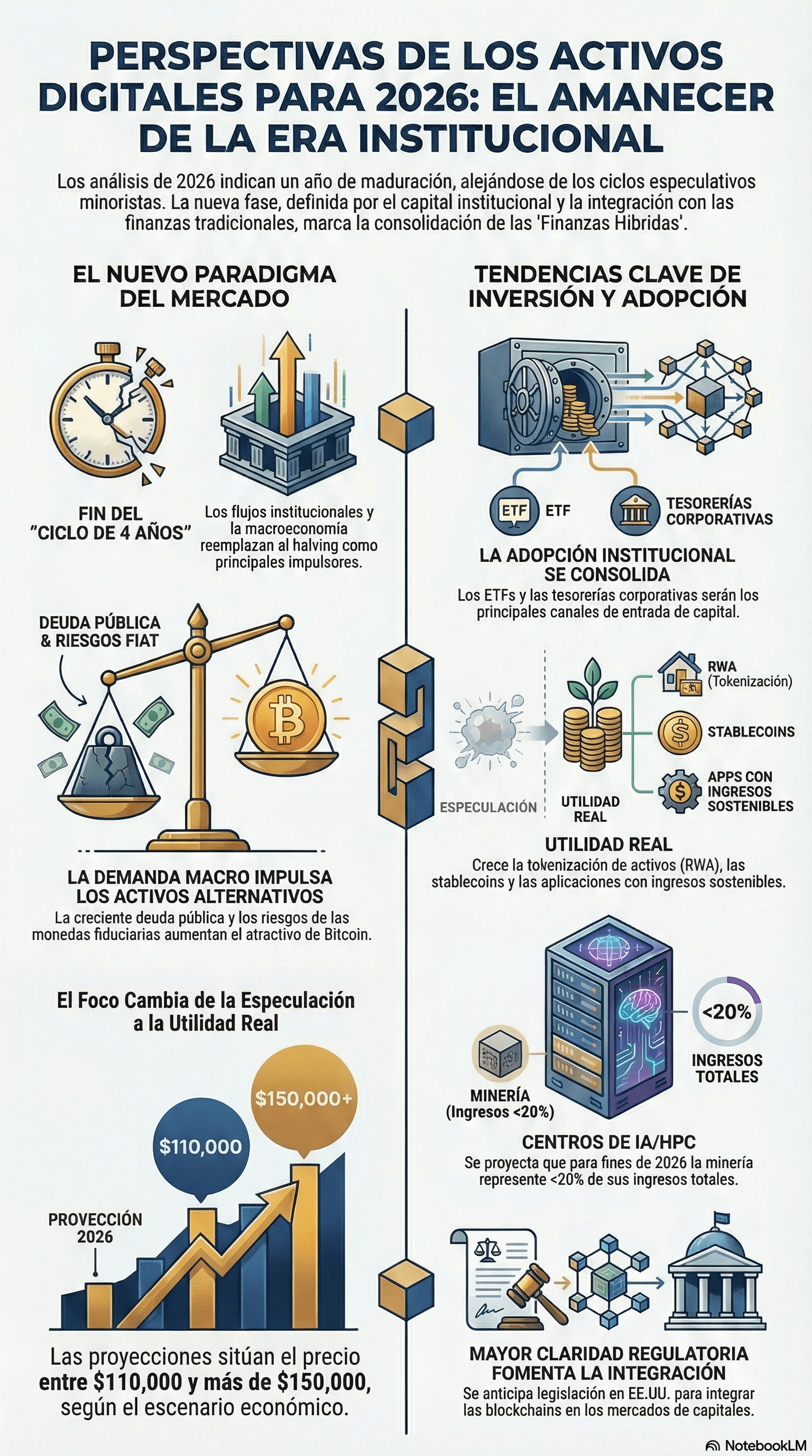 Uno dei segreti meglio custoditi dagli analisti è che il modello storico di aumenti e diminuzioni di Bitcoin, dettato dal halving, sta giungendo al termine. Le fonti sostengono che il 2026 segnerà la rottura formale di questo ciclo poiché la domanda istituzionale massiccia ora supera la rilevanza della riduzione dell'offerta mineraria. Invece di una correzione severa dopo un picco, ci si aspetta un mercato rialzista sostenuto da flussi di capitale costanti e non dall'impulso al dettaglio speculativo.