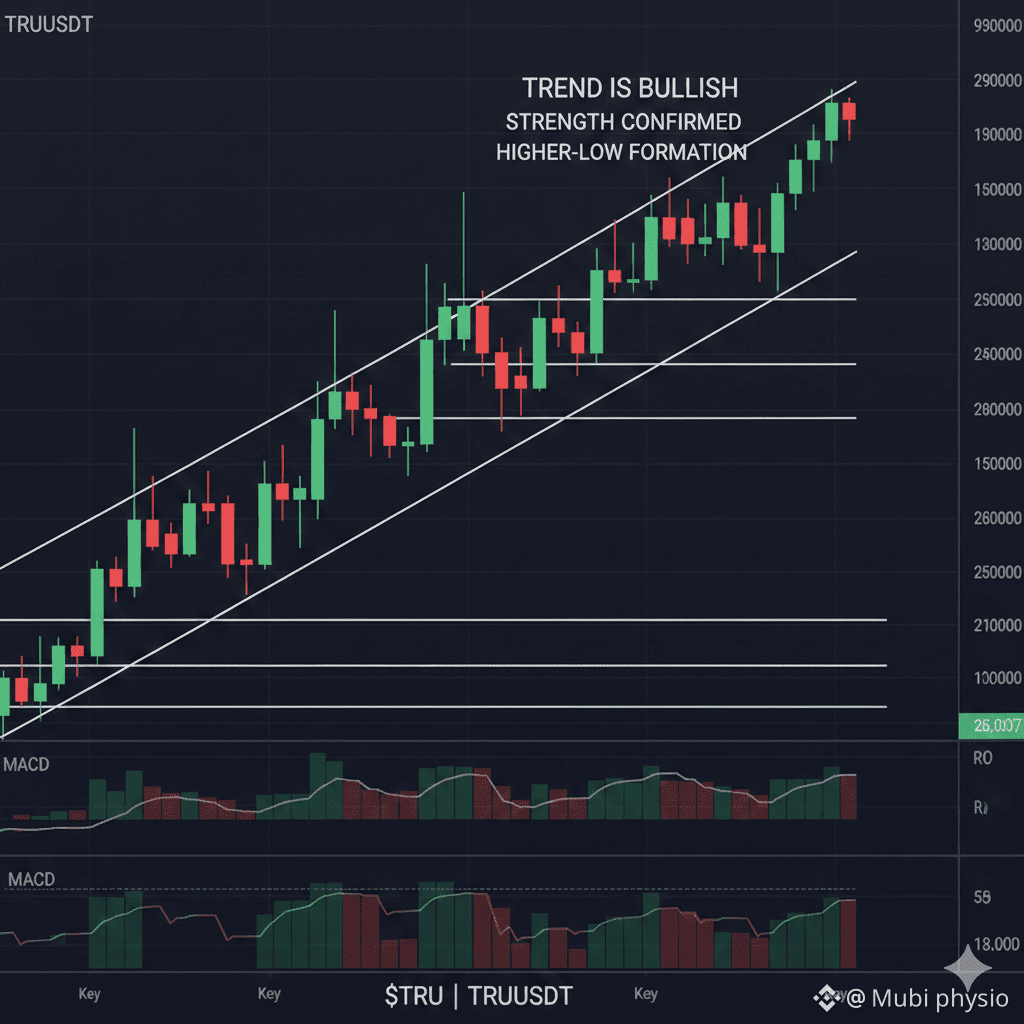 $TRU TRU continues to display a textbook bullish market structure, and the price action remains highly constructive. The chart shows a clear sequence of strong impulsive moves followed by healthy, controlled pullbacks—exactly what sustained uptrends are built on.