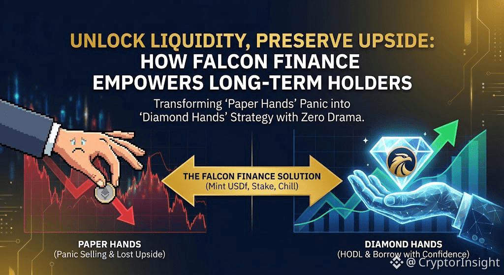 Okay, confession time – we’ve all had those moments where crypto’s volatility turns us into absolute paper hands, right? Not on the charts, where we’re all “HODL to zero” warriors with diamond hand emojis, but in real life. Picture it: market’s dipping hard, your portfolio’s red like a Solana meme coin rug, and suddenly life’s throwing bills at you – rent’s due, car’s making weird noises, or (guilty) you spot a dip in another token that’s screaming “buy me.” Next thing you know, you’re hitting sell on your precious BTC or ETH stack, muttering “just this once,” only to watch it moon weeks later while you’re kicking yourself. Classic crypto L. I’ve lived that script more times than I care to admit, from the 2022 bear to mini-panics this year. But here’s the plot twist that’s got me grinning like a degen who timed a pump perfectly: Falcon Finance turned me into a true diamond hands holder without forcing monk-mode poverty. No selling, no regrets, just pure liquidity magic in a volatile nightmare.
