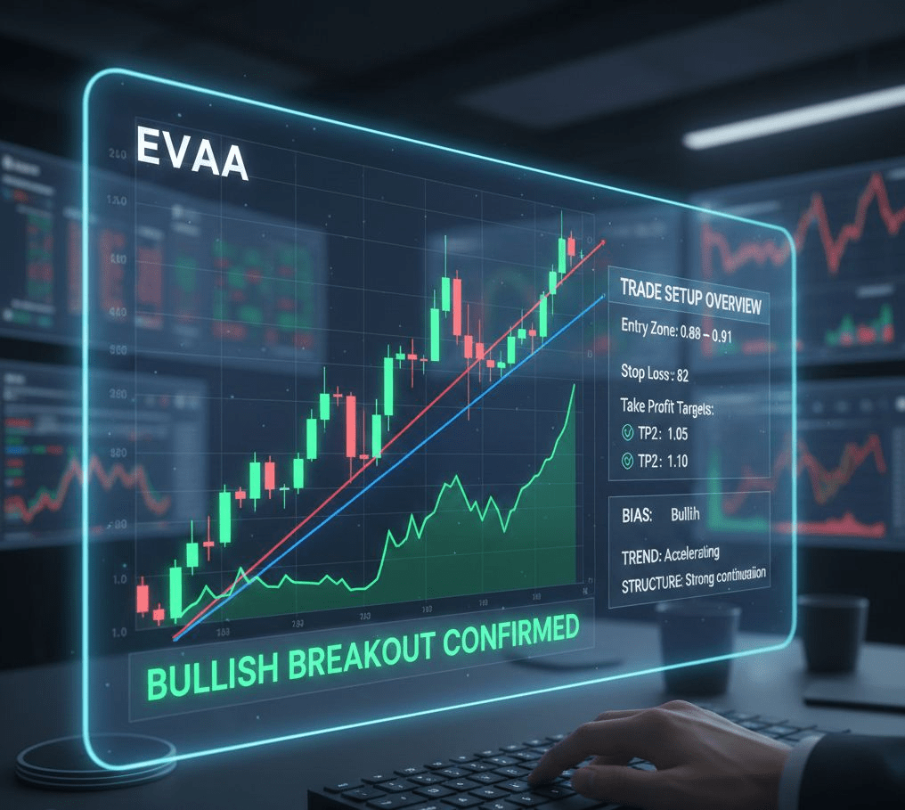 Dopo il recupero riuscito della struttura critica, EVAA si sta consolidando sopra la precedente resistenza, che ora funge da forte supporto. Finché il prezzo rimane all'interno della zona d'ingresso definita, la probabilità favorisce un'espansione al rialzo continua.