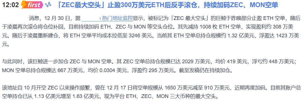 La balena conosciuta come il "maggiore short seller di ZEC" ha preso profitto per oltre 3 milioni di dollari la scorsa notte, poi ha riaperto la sua posizione short e continua a incrementare le sue scommesse contro ZEC e MON! Attualmente ha una posizione short totale di 163 milioni di dollari, solo la posizione short su ZEC vale oltre 20 milioni, e attualmente ha una perdita non realizzata di quasi 4,5 milioni e sta aumentando la posizione. Cosa significa questo? Significa che questa "grande balena" è determinata e non esita a sopportare perdite temporanee, scommettendo che ZEC scenderà drasticamente in futuro.