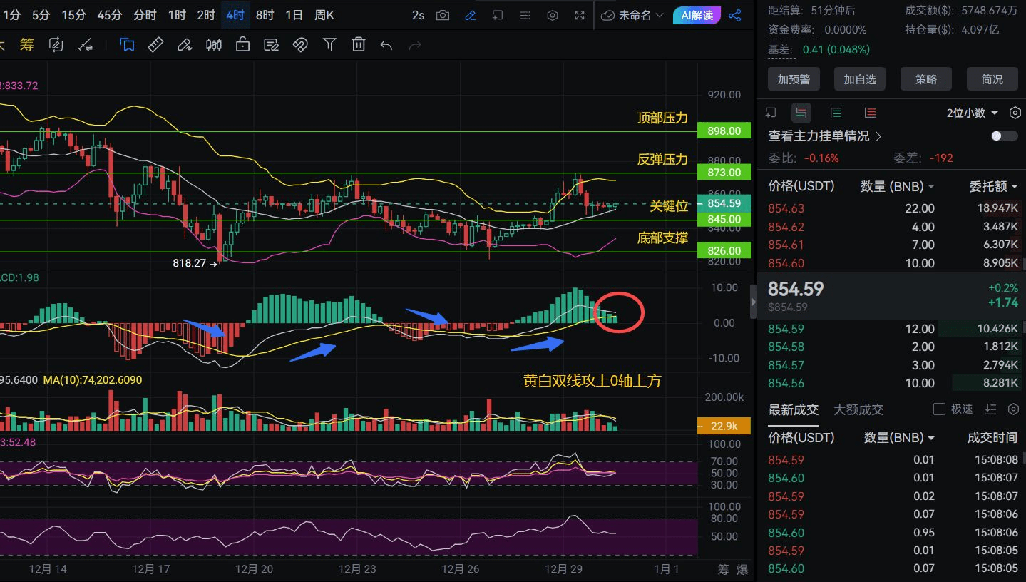 Nel grafico K-line in flessione, si nasconde un segnale chiave ignorato dalla maggior parte delle persone. Guardando il grafico K-line di BNB su 4 ore, non ti sembra di sentirti in conflitto? Il prezzo è chiaramente in flessione intorno a 854,59, non riesce a salire né a scendere. Molte persone sono in difficoltà tra il livello di resistenza di 873 e il livello di supporto di 826.