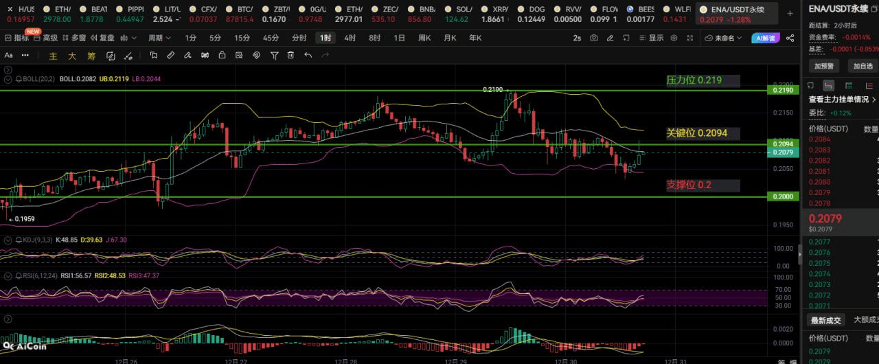 Voglio seguire i fratelli che vogliono entrare: controllatevi! Ora assolutamente non è il momento di comprare a prezzi alti. Se proprio non potete resistere, aspettate solo due situazioni: oppure aspettate che si verifichi un'espansione di volume con un breakout stabile sopra 0.219, e poi entrare con posizione leggera al ritorno; oppure aspettate che scenda nell'area di supporto 0.202-0.205, si stabilizzi e poi entrate con piccola posizione per giocare un rimbalzo.