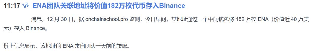 Inizio con un secchio d'acqua fredda: fratelli, poco fa ho visto una notizia che mi ha svegliato dal torpore. L'indirizzo associato al team ENA ha, stamattina, tramite un portafoglio intermedio, segretamente infilato 1.820.000 ENA su Binance, per un valore vicino ai 400.000 dollari! Questa notizia è come se stessi mangiando hot pot e cantando, e all'improvviso senti dire che il cuoco sta per spegnere il fuoco e scappare, non ti viene un colpo al cuore?