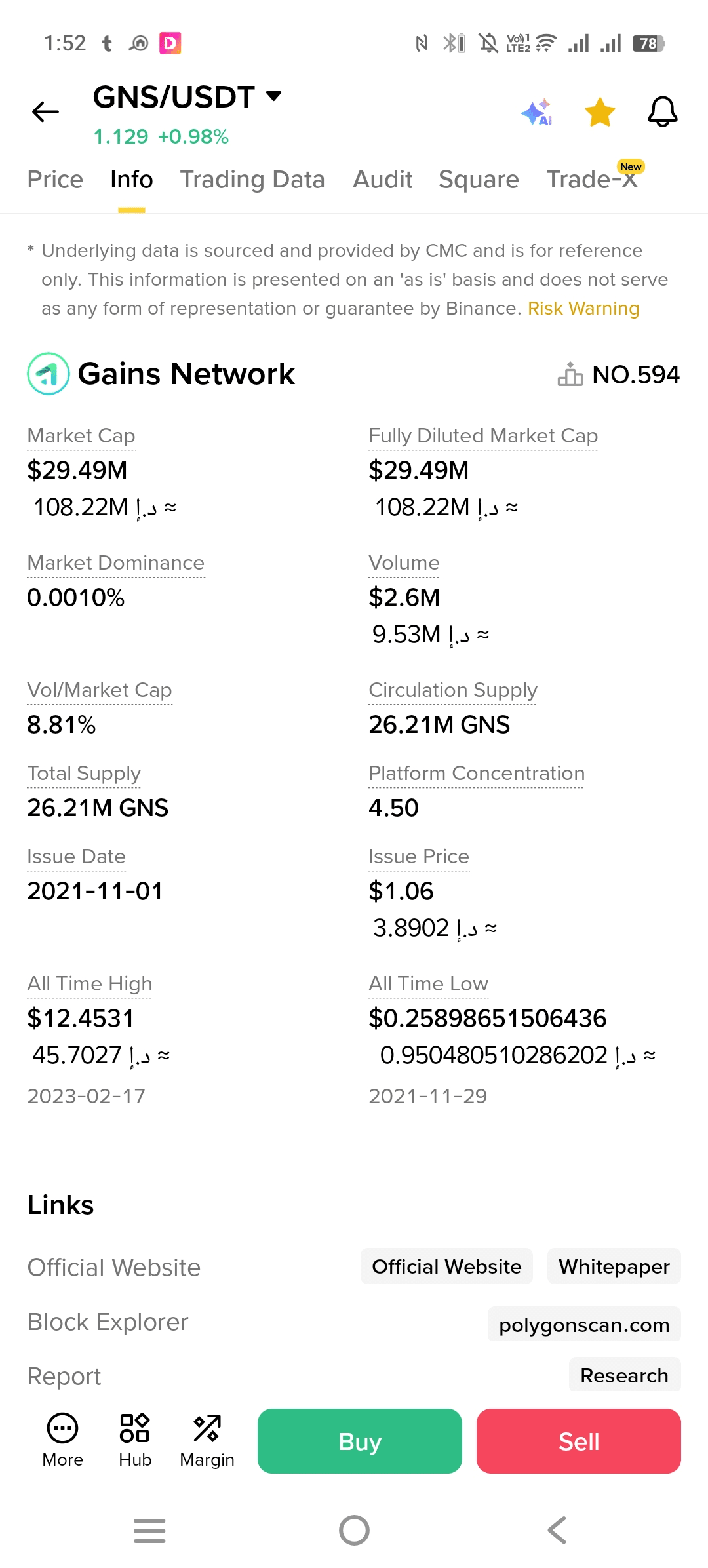 $1.129 USDT ➡️ Il prezzo attuale di GNS rispetto a USDT.