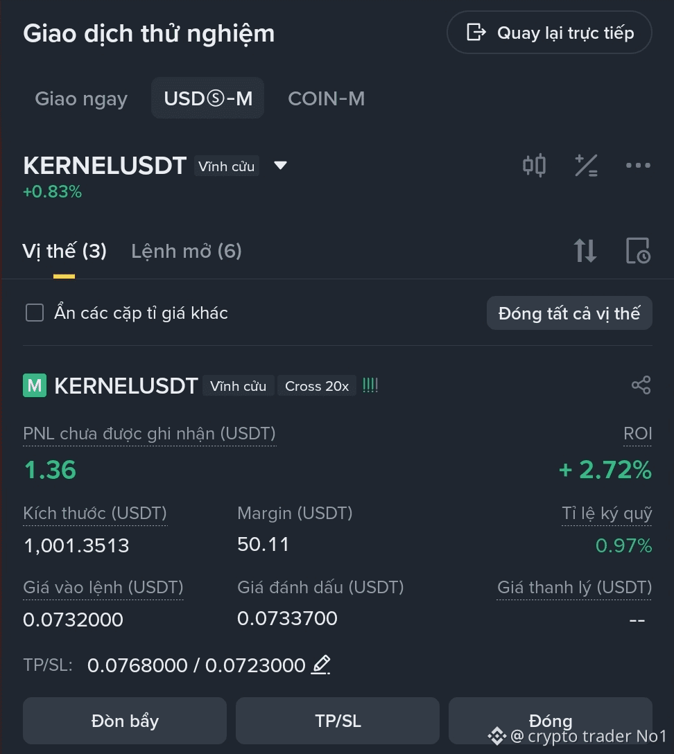 Ở lệnh này $KERNEL ae để ý là ngay từ đầu mình để Sl rất gần với Entry nhưng lại rất an tâm, tính tới thời điểm hiện tại đc nửa ngày rồi nó vẫn giữ vững và có xu hướng đi lên. Mình sẽ đợi nó lên phá qua vùng cản trên để rời Sl về Entry bảo toàn lệnh. Đây cũng là một bài học xương máu của mình, trước khi nghĩ tới lợi nhuận thì cần phải đảm bảo lệnh đc an toàn.