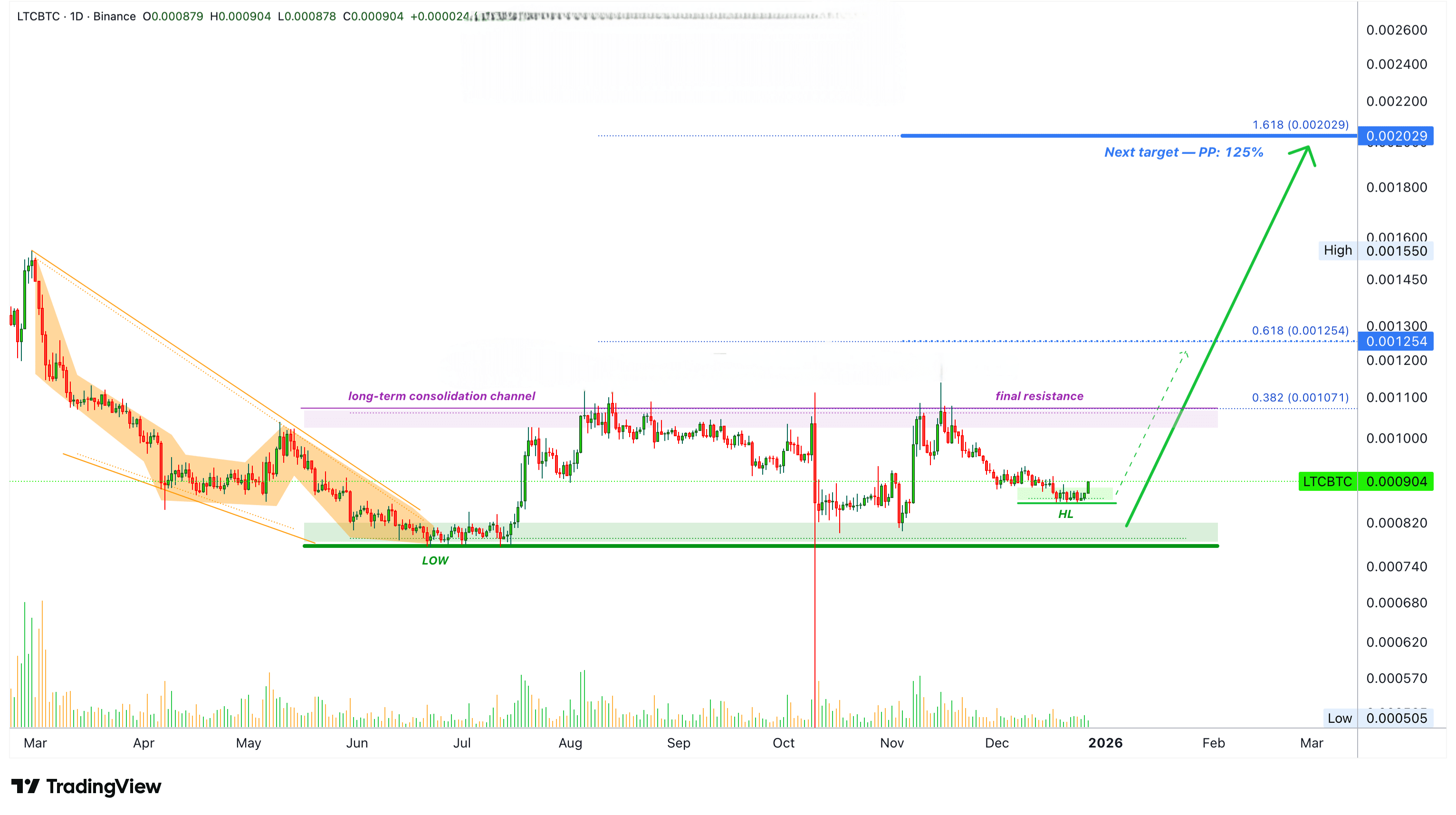 LTCBTC si sta muovendo all'interno di un canale laterale a lungo termine—consolidamento—attivo da maggio. Immediatamente la resistenza si trova a 0.001071, la zona viola sul grafico. Questo livello ha prodotto il primo rifiuto ad agosto, poi di nuovo a ottobre e infine di nuovo a novembre, il mese scorso.