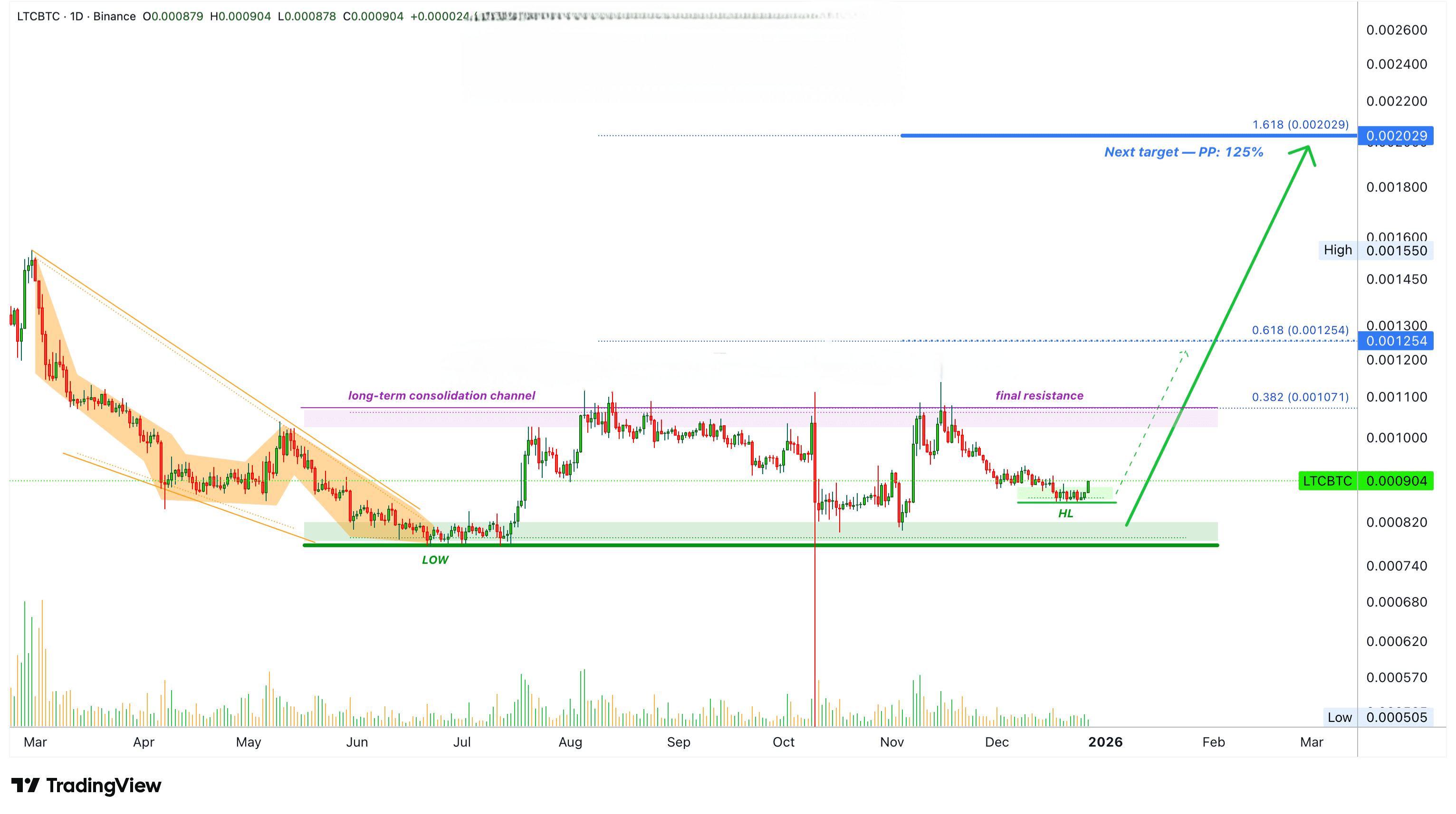 LTCBTC si muove all'interno di un canale laterale rialzista—consolidamento—attivo da maggio. Immediatamente, si trova resistenza a 0.001071, l'area viola nel grafico. Questo livello ha prodotto il primo rifiuto ad agosto, poi di nuovo a ottobre e infine di nuovo a novembre, il mese scorso.