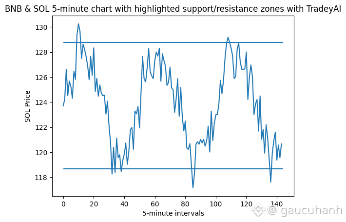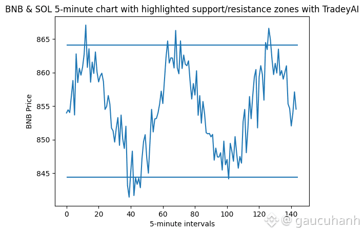 BNB & SOL 5-minute chart showing TradeyAI-identified support and resistance zones, helping intraday traders anticipate reactions instead of chasing price.