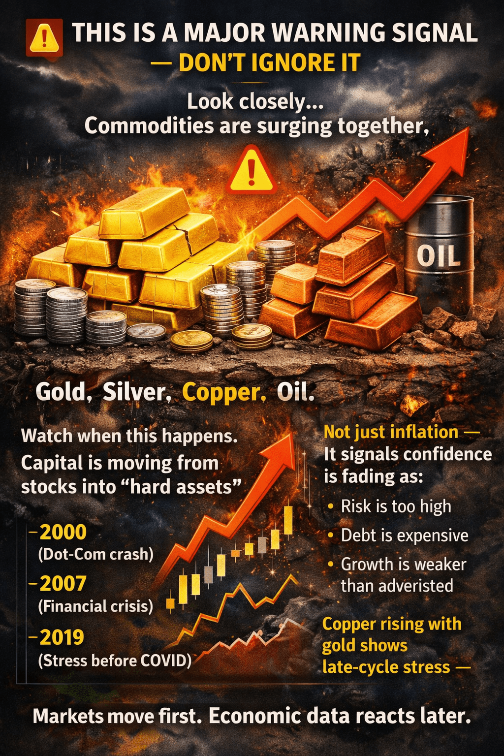In un ambiente economico sano, le materie prime si muovono in modo selettivo. Alcune salgono, altre scendono. Ma quando tutto aumenta contemporaneamente, di solito significa che lo stress si sta accumulando silenziosamente sotto la superficie.