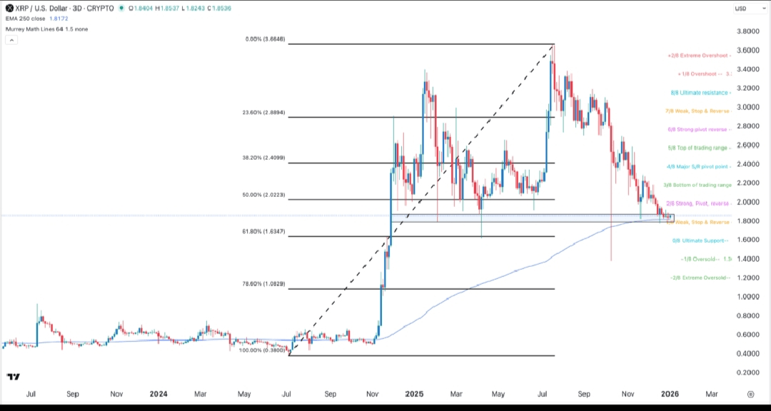 Il grafico di tre giorni mostra che il prezzo di XRP è crollato dai massimi dello scorso anno di $3.6646 a luglio al suo livello attuale di $1.8520. È rimasto leggermente sopra la media mobile esponenziale (EMA) a 250 giorni.
