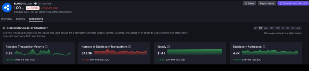 La stablecoin RLUSD ha guadagnato oltre 1,4 miliardi di dollari in attivi, in aumento del 7,8% rispetto allo stesso periodo del mese scorso. Inoltre, il numero di indirizzi è aumentato del 4,85% a 4.400, mentre il volume delle transazioni corretto è aumentato del 62% a 3,2 miliardi di dollari.