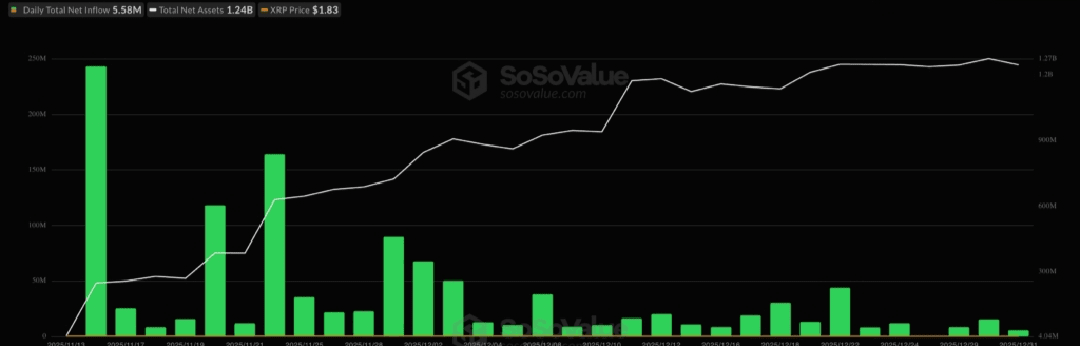 Il prezzo di XRP probabilmente continuerà a salire quest'anno a causa degli afflussi ETF in corso. I dati mostrano che gli afflussi ETF XRP sono saliti a 1,17 miliardi di dollari, portando il suo totale netto di attivi a 1,24 miliardi di dollari.