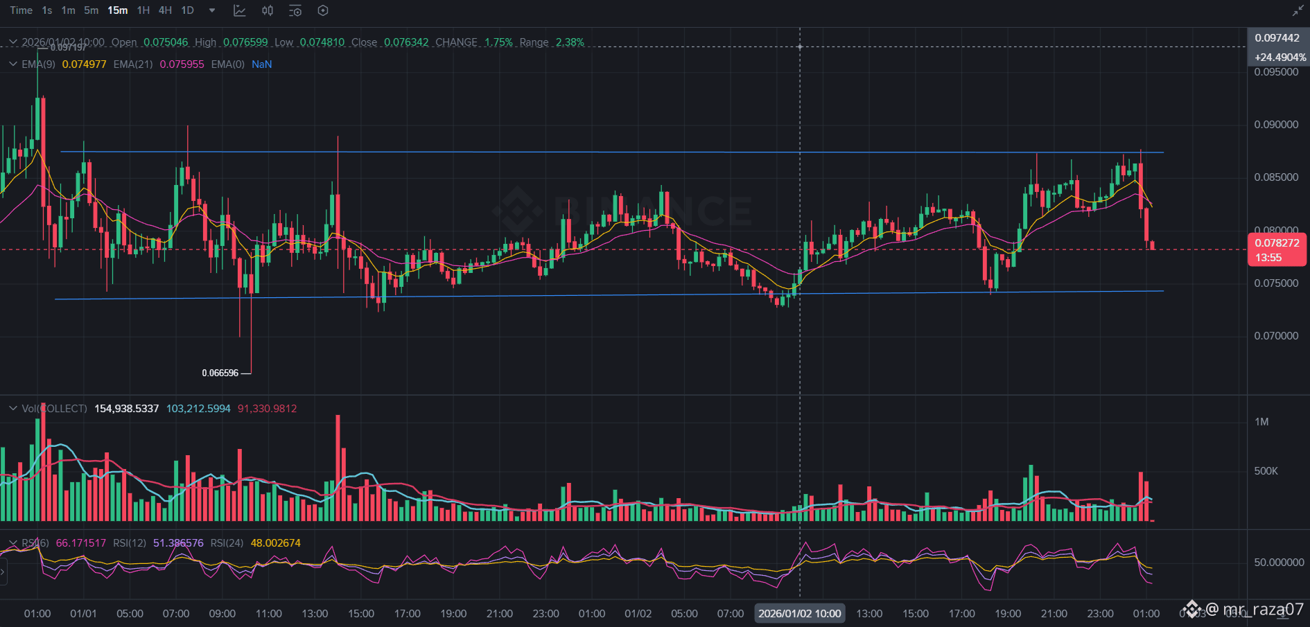 $COLLECT is showing strength on the 15-minute chart after a clean bounce off support. Price is now trading above key EMAs with rising volume and improving RSI — signaling bullish momentum.