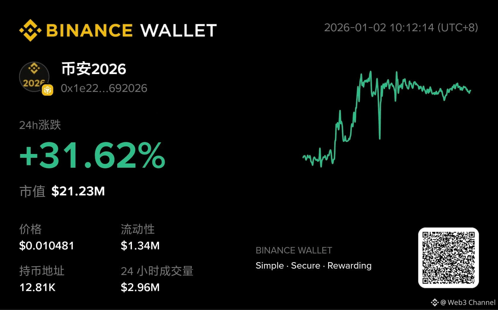 综合链上活跃度、交易表现、社交传播、审计进展以及钱包收录等多重因素,“币安2026”已毫无疑问地成为当前MEME板块中的焦点项目之一。其当前已进入关键观察区间,后续走势将取决于新增参与、成交量变化及热度延续情况。