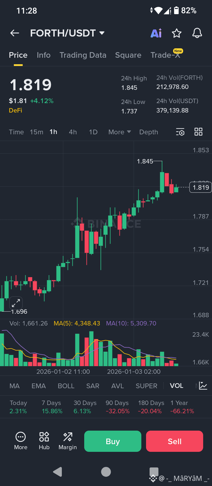 The price of FORTH is looking good because people are buying and selling it a lot. FORTH has a value of 27.83 million dollars and people traded 4.12 million dollars of FORTH in the last 24 hours. This means that FORTH is getting more popular and people want to buy it. There are people buying and selling FORTH so the price does not go up and down too much. The fact that there is not much FORTH available helps to keep the price steady as more people get involved with FORTH.