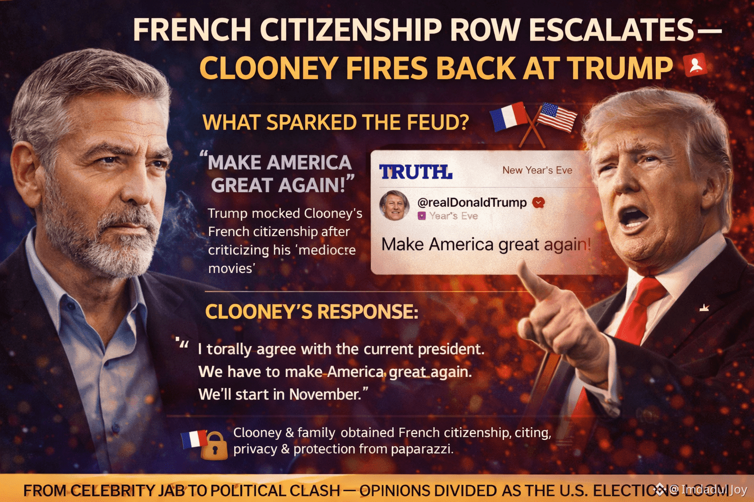 🇫🇷🇺🇸 LA CONTROVERSA SULLA CITTADINANZA FRANCESE SI AGGRAVA — CLOONEY RISPONDE A TRUMPQuesta interazione è un esempio classico di come il dibattito politico moderno si sia spostato dai dibattiti su politiche pubbliche a scontri culturali di alto profilo. Anche se potrebbe sembrare "chiacchiere innocue" in superficie, il momento e il contesto suggeriscono una posizione politica calcolata da entrambi i lati.