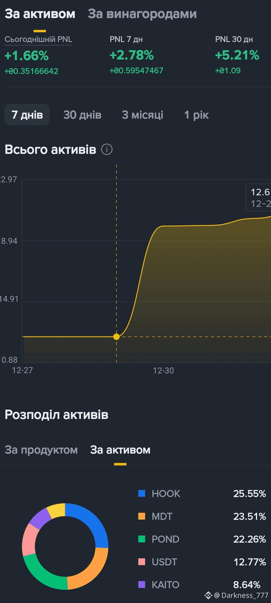 Зараз мій топ-3 виглядає так: $HOOK (25.5%), $MDT (23.5%) та $POND (22.2%). Це дозволяє мені не залежати від руху однієї монети.