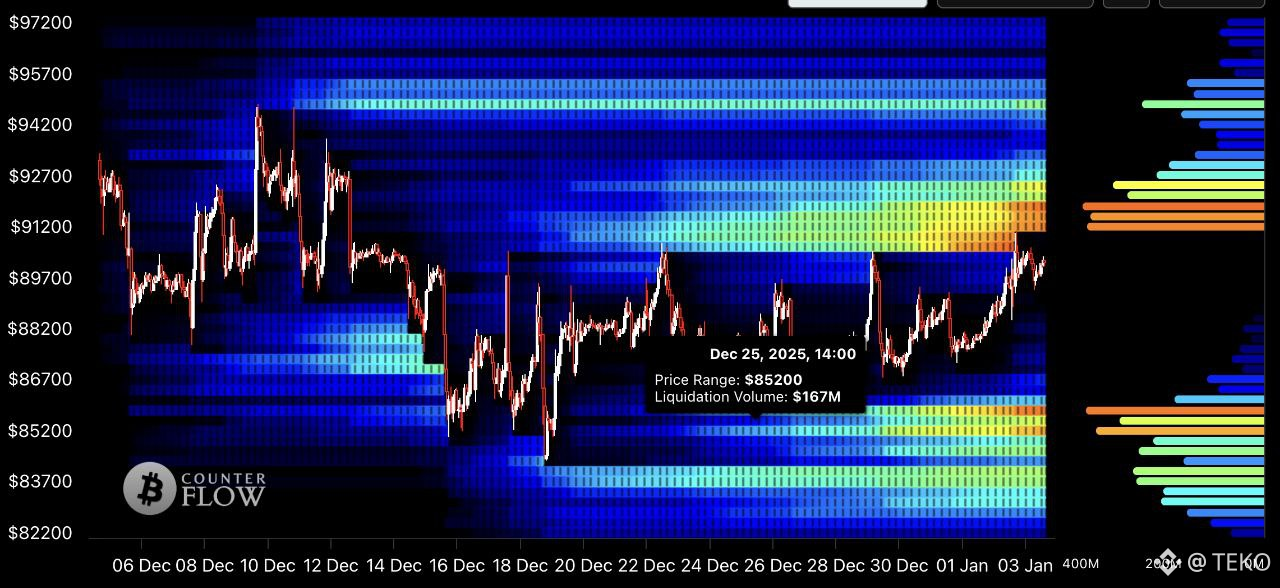 المنطقة بين 91,200$ و 92,700$ مكتظة بعقود "الشورت" التي ستعمل كوقود للصعود. اختراق حاجز الـ 91k سيفعّل "Short Squeeze" يدفع السعر بسرعة عبر الفراغ السعري وصولاً للهدف الأكبر عند 94,000$.