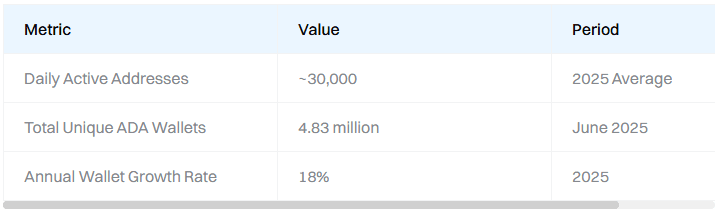 📌 Il numero totale di portafogli unici ADA ha raggiunto circa 4,83 milioni, con un numero medio giornaliero di nuovi portafogli di circa 1.700 nel 2025 — un segno di acquisizione costante di utenti e di penetrazione globale.