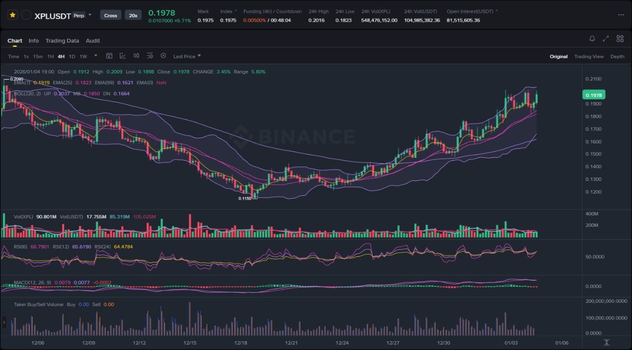La coppia XPL/USDT su Binance mostra una struttura intraday dinamica nei recenti periodi, caratterizzata da un breakout impulsivo da un canale ribassista di diversi giorni. L'azione del prezzo rivela diversi elementi osservabili chiave: una chiara rigetto al recente minimo di swing vicino ai livelli iniziali di dicembre, seguito da un'espansione della volatilità con ombre lunghe verso l'alto su candele orarie che segnalano una pressione acquistatrice aggressiva; una fase di consolidamento stretta appena sotto la resistenza a $0.17 prima del rialzo del 15%; e ora, primi segni di distribuzione con divergenza di volume mentre il prezzo testa i massimi locali di swing. Gli indicatori di momentum, inclusi l'RSI che è salito sopra i 70 e il MACD che mostra un crossover rialzista con barre dell'istogramma in espansione, evidenziano i rischi di sovrastima a breve termine. Nel complesso, la struttura tende verso un bias rialzista a causa del decisivo breakout dal canale e del lavaggio della liquidità dei minimi precedenti, che ha assorbito la pressione ribassista e favorito minimi più alti — suggerendo accumulo piuttosto che esaurimento. Tuttavia, senza un volume confermato in aumento nei ritest, potrebbe degenerare in un movimento confinato in gamma.