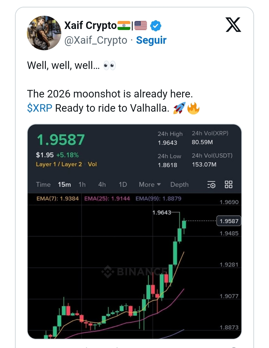 La struttura tecnica presentata mostra l'XRP scambiato vicino al livello di 1,95 USD dopo aver superato la recente resistenza intraday, con l'azione del prezzo che si mantiene vicina al massimo della sessione. Il movimento è avvenuto insieme all'aumento del volume, rafforzando la visione che gli acquirenti stanno attivamente sostenendo la tendenza, invece di fare affidamento sulla bassa liquidità.