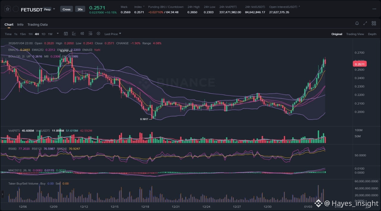 The chart reveals FET trading near $0.26 after a decisive breakout from a multi-month descending channel, marking the end of a 6-month bearish streak. Volume profile highlights liquidity pockets below recent lows, now acting as potential support, while the price has steadied post-impulse. Oscillators like RSI show momentum divergence from prior downtrend lows, with MACD histogram expanding positively. Open interest remains elevated, suggesting positioned traders anticipate follow-through, though broader crypto indices hover in consolidation amid macroeconomic uncertainty.