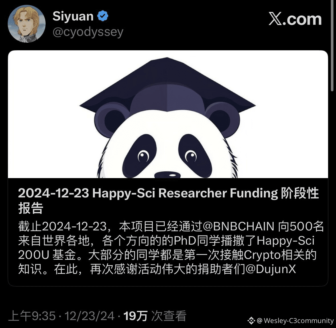 Happy-Sci由ABCDE合伙人Siyuan (CyOdyssey) 于2024年发起,是一位区块链从业者对科研生态的个人慈善实践。项目发起时完全为个人行为,与其后来加入的YZi Labs无关,体现了纯粹的公益初心。