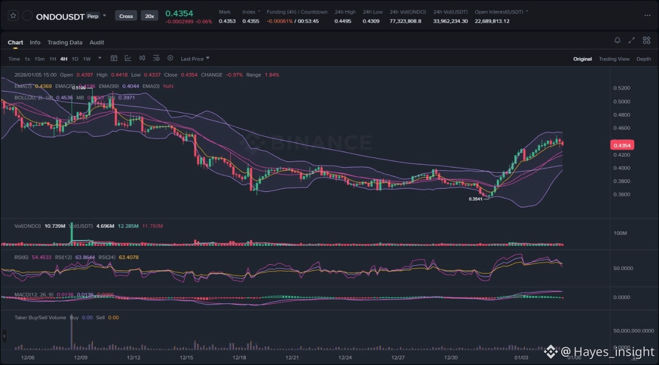 ONDO has navigated a volatile 2025, with the token reflecting broader RWA sector dynamics amid macroeconomic shifts and crypto market rotations. The provided 4-hour chart displays a clear descending channel since mid-2025 highs, characterized by lower swing highs and lows, culminating in a multi-week range around recent local lows. Trading volume indicators show contraction during the descent, suggesting accumulation rather than aggressive distribution, while the RSI oscillator hovers in neutral territory near 40, hinting at potential mean reversion if support holds. Overall market cap for RWA tokens has expanded, but ONDO's relative strength lags slightly, positioning it for catch-up potential in a risk-on environment.